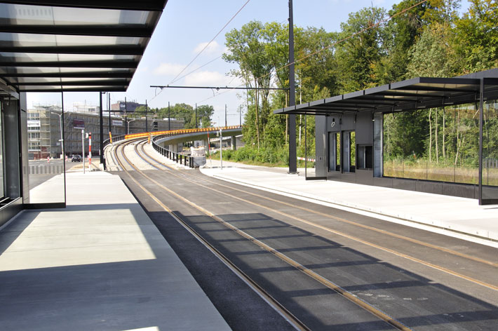 Viadukt Glattzentrum, Rampe Neugut; Schienen und Fahrleitung sind komplett. Aufnahme: 19. Sept. 10