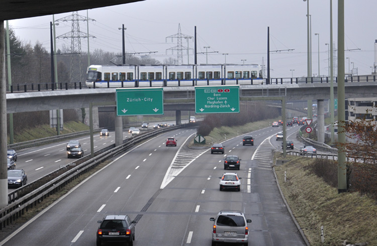 12. Dezember 2010. Eröffungstag. Die Züge fahren fahrplanmässig von Dübendorf zum Flughafen Zürich.Hier der Viadukt Glattzentrum, der über die Autobahn A1 führt