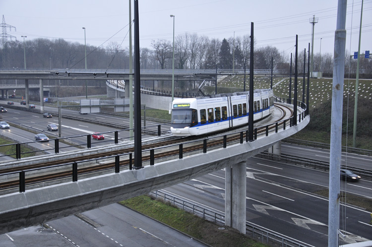 12. Dezember 2010, Eröffnungstag. Nach 2-jähriger Bauzeit, fährt die Glattalbahn fahrplanmässig vom Bahnhof Stettbach (Dübendorf) zum Flughafen Zürich. Hier über den Viadukt Glattzentrum über dieAutobahn A1